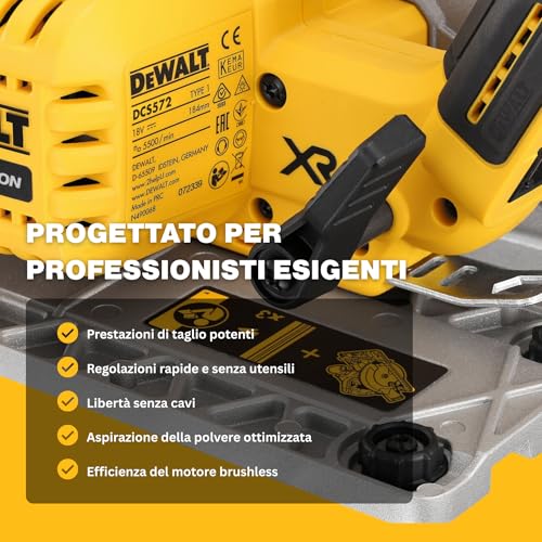 DEWALT XR 18V Sega Circolare Brushless 184mm, Compatibile con Guida, Taglio 58mm, Regolazione Senza Utensili, Valigetta TSTAK, LED, Aspirazione Polveri AirLock, Corpo Macchina – DCS572NT-XJ