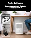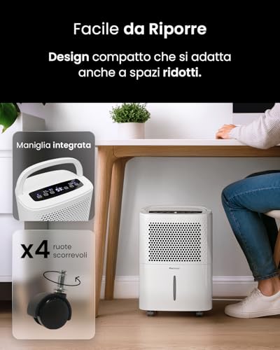 | Caratteristiche speciali | Ideale per luso in ambienti di grandi dimensioni con problemi di umidità persistenti, tubo di drenaggio continuo incluso, estrae fino a 12 litri di umidità al giorno, modalità solo ventola per la circolazione dellaria, display a LED e pannello tattile, sensore automatico di umidità umidostato |